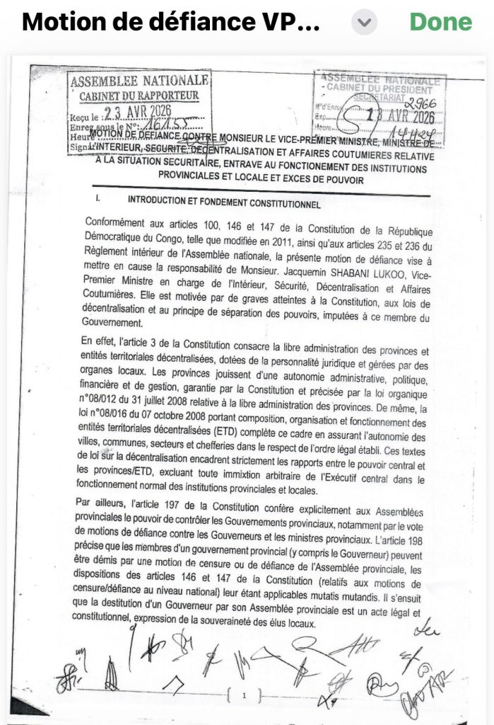 La tension est montée d’un cran, l’Assemblée nationale examinera ce mercredi 29 Avril 2026 la motion de défiance visant le vice-Premier ministre en charge de l’Intérieur, Jacquemin Shabani. Inscrite à l’ordre du jour après plusieurs attentes et un report, cette motion, qui totalise 56 signatures, est désormais au cœur des débats parlementaires.