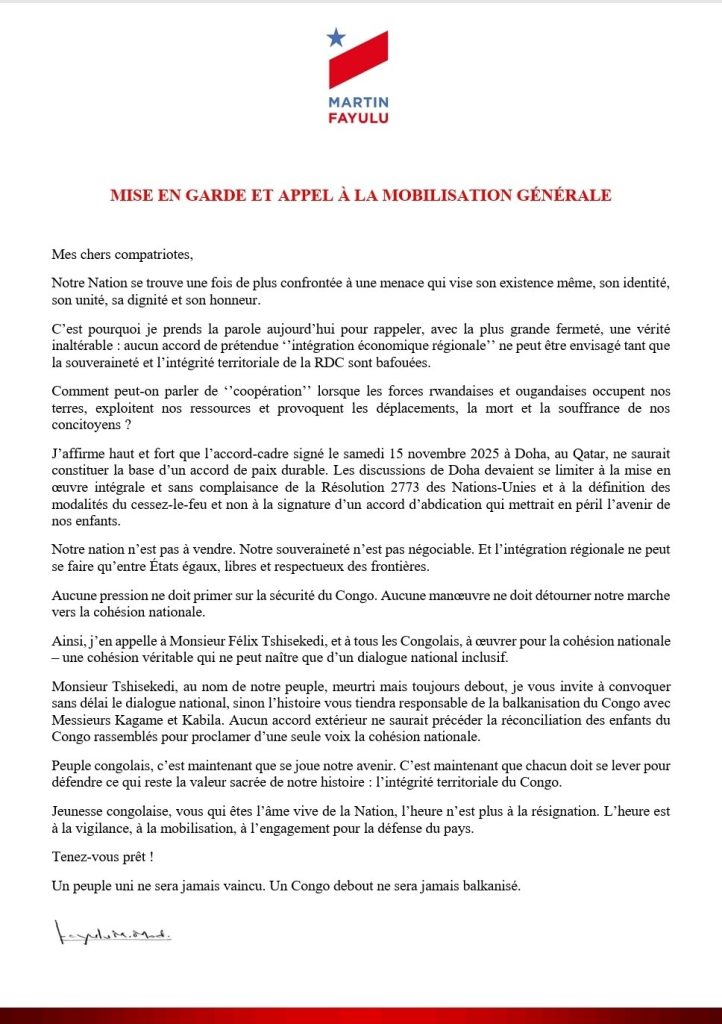 En outre, Martin Fayulu met la pression sur Tshisekedi : « Organisez immédiatement un dialogue national. Sans cela, l’histoire tiendra le Président responsable d’une possible balkanisation du Congo. » Un message fort pour un peuple meurtri mais toujours debout, dit-il.