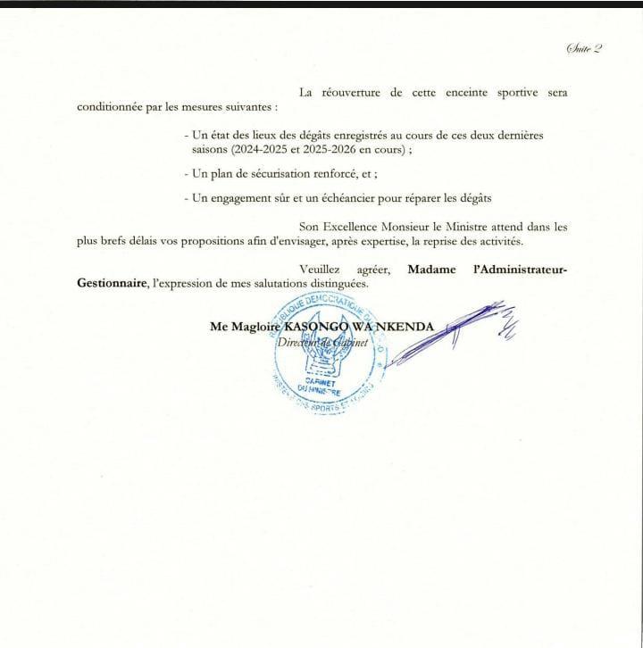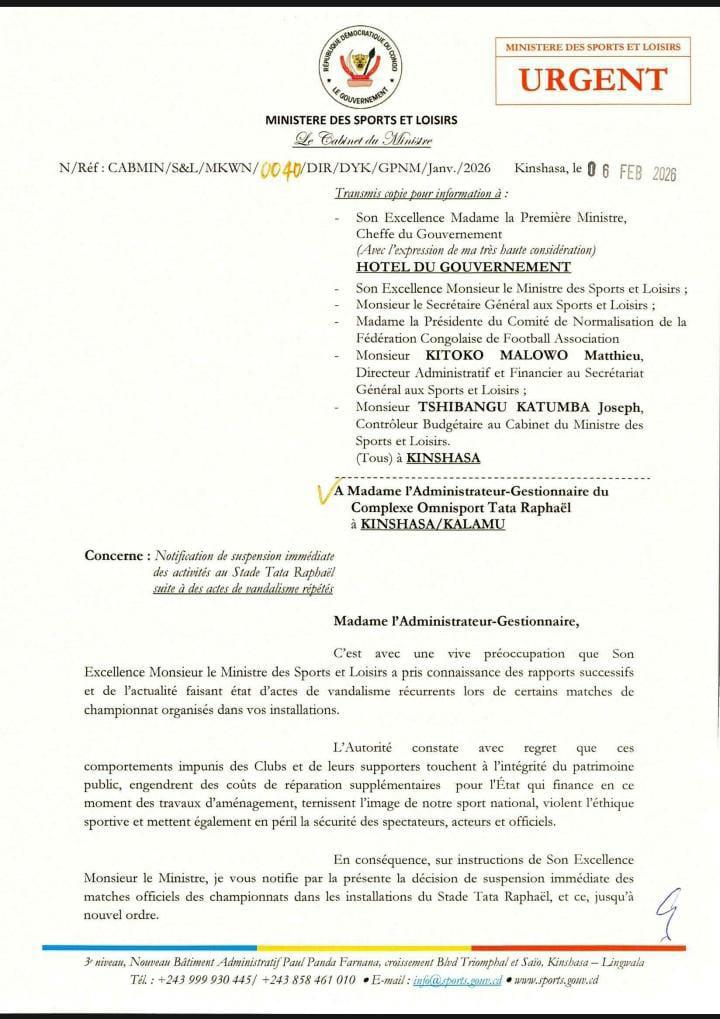 Dans une correspondance adressée à Madame l’admistrateur-Gestionnaire du stade Tata Raphaël, le Ministère des sports et loisirs, constate avec regret la récurrence des actes de vandalisme lors des matchs du championnat national.