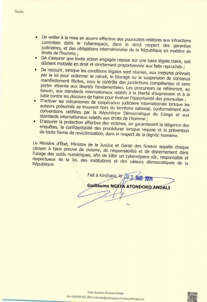 Il a enjoint aux autorités judiciaires de poursuivre sans délai tout auteur d’infraction numérique, qu’il soit présent sur le territoire national ou à l’étranger, dans le cadre des conventions internationales ratifiées par la RDC.