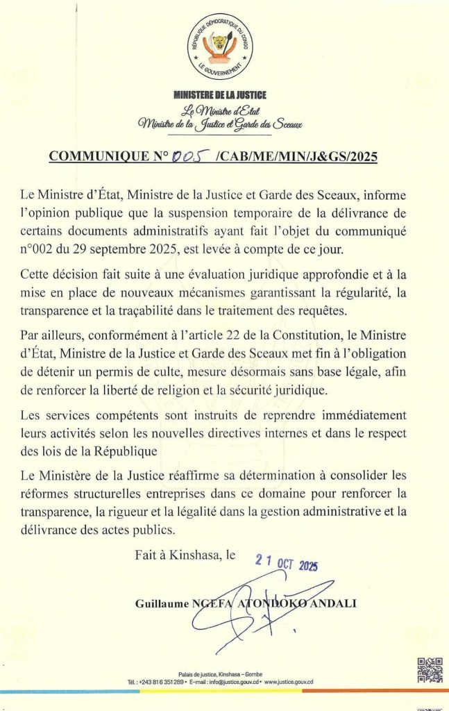 A la unePolitique Justice : l’obligation d’un permis de culte instaurée par Mutamba, est désormais supprimée par Guillaume Ngefa Last updated: 2025/10/21 at 9:18 PM Rufus Lukanga Share SHARE You Might Also Like 30 Avril : la nation célèbre les enseignants Assemblée nationale : la motion de défiance contre Jacquemin Shabani rejetée Transport : l’aéroport international de Ndjili se modernise Ass.Nat. : la motion de défiance contre J.Shabani en examen ce mercredi en plénière Assemblée nationale : adoption des conclusions des rapports sur les accords RDC–USA et RDC–Rwanda, ainsi que sur l’audition de membres du gouvernement Rufus Lukanga 21 octobre 2025 21 octobre 2025 Share This Article Facebook Twitter Whatsapp Whatsapp LinkedIn Telegram Email Copy Link Print Previous Article Assemblée Nationale : les agents administratifs paralysent les activités en mouvement de réclamation de leur salaire Next Article ASSEMBLÉE NATIONALE : Plénière consacrée à la réintégration de deux élus, adoption de deux projets de loi et publication imminente du calendrier électoral pour les postes vacants Leave a comment Laisser un commentaire Annuler la réponseVotre adresse e-mail ne sera pas publiée. Les champs obligatoires sont indiqués avec *Commentaire * Nom * E-mail * Site web Enregistrer mon nom, mon e-mail et mon site dans le navigateur pour mon prochain commentaire. Suivez-nous 16.6k Followers Like 13.7k Followers Follow 16.8k Followers Follow 147.7k Subscribers Subscribe QUI EST JEAN-MARIE KASSAMBA ? Jean-Marie Kassamba est une figure emblématique du journalisme congolais, reconnu pour son engagement en faveur de la presse libre et de qualité en République Démocratique du Congo (RDC). LIRE