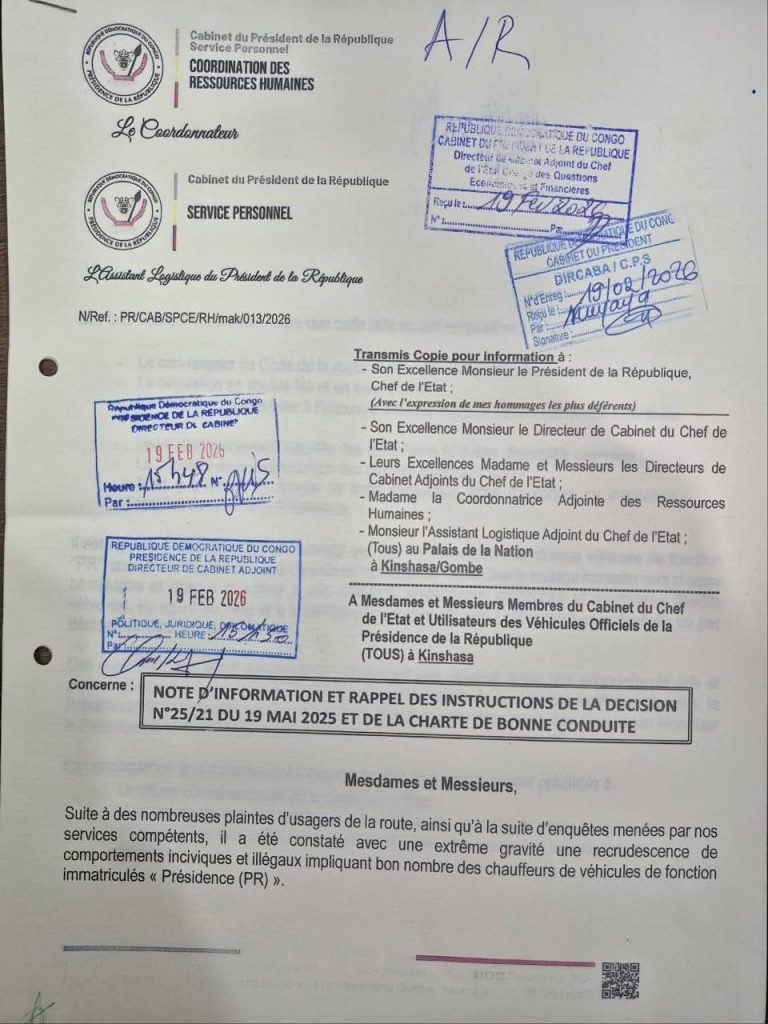 ‎‎‎C’est à travers une note d’information qui inclut un rappel des instructions de la décision et de la charte de bonne conduite que la coordination des ressources humaines du cabinet du président de la République déplorent le comportement routier de certains personnels.‎