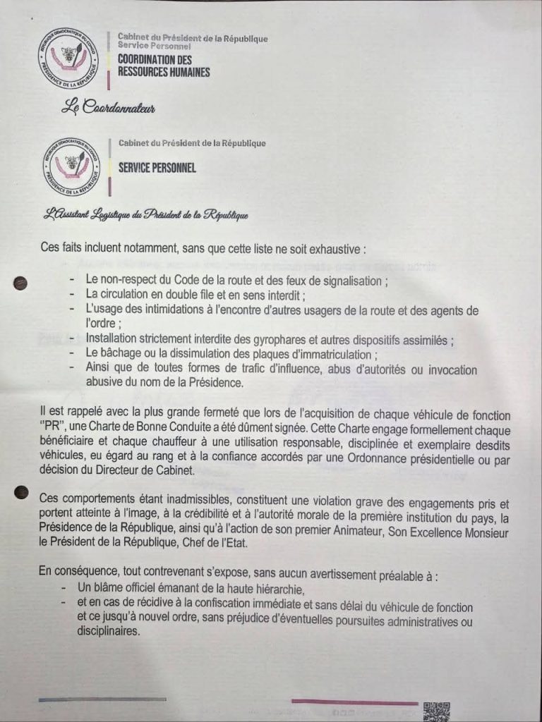 ‎‎Ces comportements constituent « une violation grave des engagements pris » et portent atteinte à l’image, à la crédibilité et à l’autorité morale de la Présidence. ‎‎En conséquence, préviennent- ils, « tout contrevenant s’expose, sans avertissement préalable, à un blâme officiel,  confiscation immédiate et sans délai du véhicule de fonction, et ce jusqu’à nouvel ordre, sans préjudice d’éventuelles poursuites administratives ou disciplinaires »