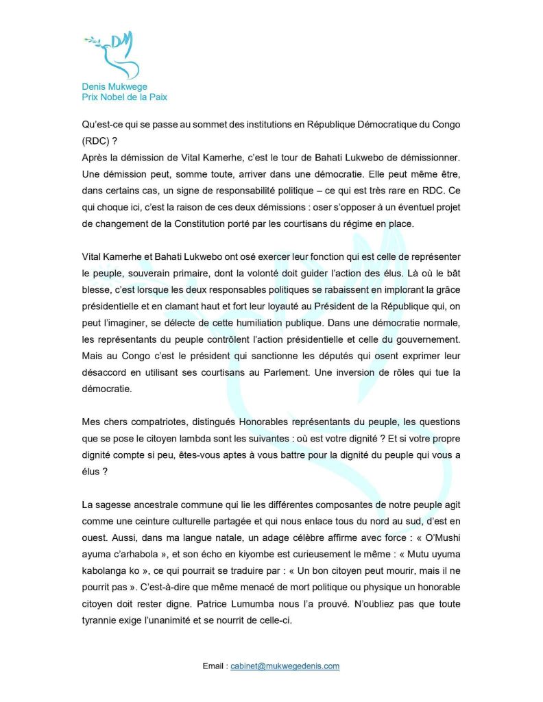 La scène politique congolaise est secouée par une nouvelle prise de position forte du Prix Nobel de la paix, Denis Mukwege, qui s’inquiète ouvertement d’une dérive institutionnelle au sommet de l’État. Dans une déclaration au ton grave, il revient sur les récentes démissions de Vital Kamerhe et de Bahati Lukwebo, qu’il relie à leur opposition présumée à un projet de révision constitutionnelle.