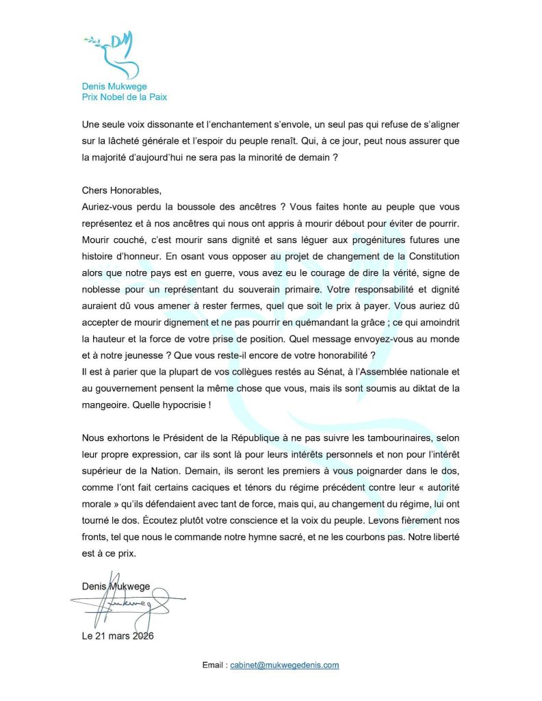 Il estime que ces départs traduisent avant tout des pressions exercées sur des responsables politiques ayant osé s’opposer à une modification de la Constitution, perçue comme une remise en cause du pacte républicain.Dans son analyse, Denis Mukwege dénonce une inversion des rôles au sein des institutions.